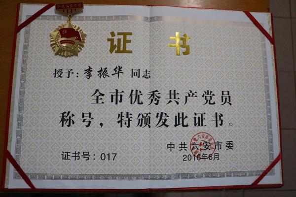 李振華同誌被(bèi)授予六(liù)安(ān)市優秀(xiù)共產黨員榮譽稱號